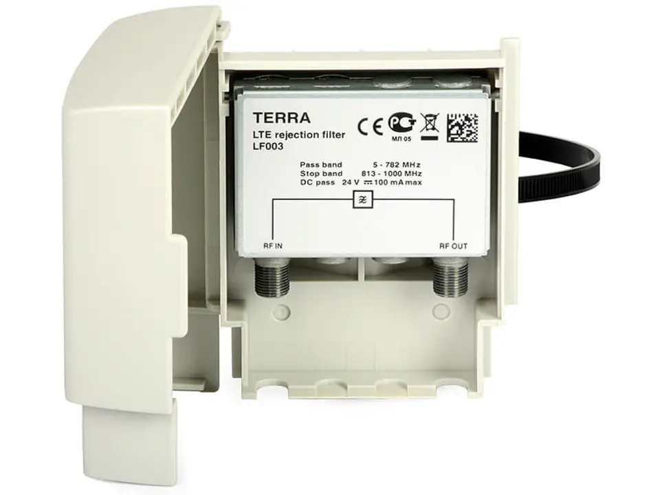 Filtr LF003 Terra stosowany jest w instalacjach telewizyjnych - montowany na maszcie zaraz za zestawem antenowym. Służy do filtrowania niepożądanych sygnałów w paśmie 800MHz (częstotliwości 791- 862 MHz) przeznaczonym na realizację usług transmisji danych (LTE). Jest szczególnie zalecany dla instalacji wykorzystujących szerokopasmowe wzmacniacze obejmujące pełne pasmo UHF (do częstotliwości 862MHz). W tego typu instalacjach, zakłócenia będące wynikiem odbioru niepożądanych sygnałów mogą skutecznie uniemożliwić odbiór naziemnej telewizji cyfrowej DVB-T.