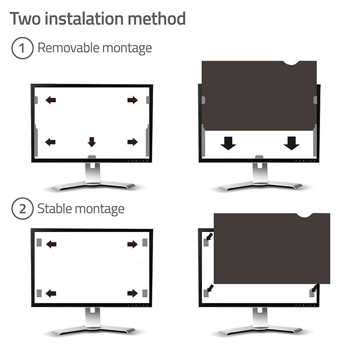 | Informacje dodatkowe: | Możliwe dwie techniki zamontowania: - trwały montaż umożliwiają transparentne samoklejące paski, które są montowane bezpośrednio do ekranu, - montaż tymczasowy umożliwiają transparentne prowadnice, które montowane są na ramie monitora. Opcja ta umożliwia łatwy demontaż filtra. |