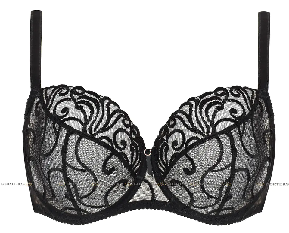 Kuszący biustonosz z miękkimi miseczkami zapewnia atrakcyjnie wyglądający dekolt. Miseczki wykonano z tiulu elastycznego, obszytego ozdobnym haftem.