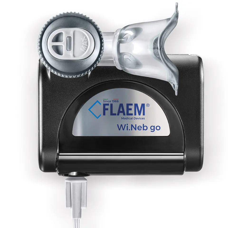 Najnowszy inhalator filmy FLAEM. Bardzo cicha praca i niskie zużycie energii. Ze względu na swoją innowacyjną technologię Wi.Neb Go osiągnął wysoką moc, kompaktowe wymiary i lekkość - dzięki czemu jest idealnym inhalatorem domowym jak i przenośnym
