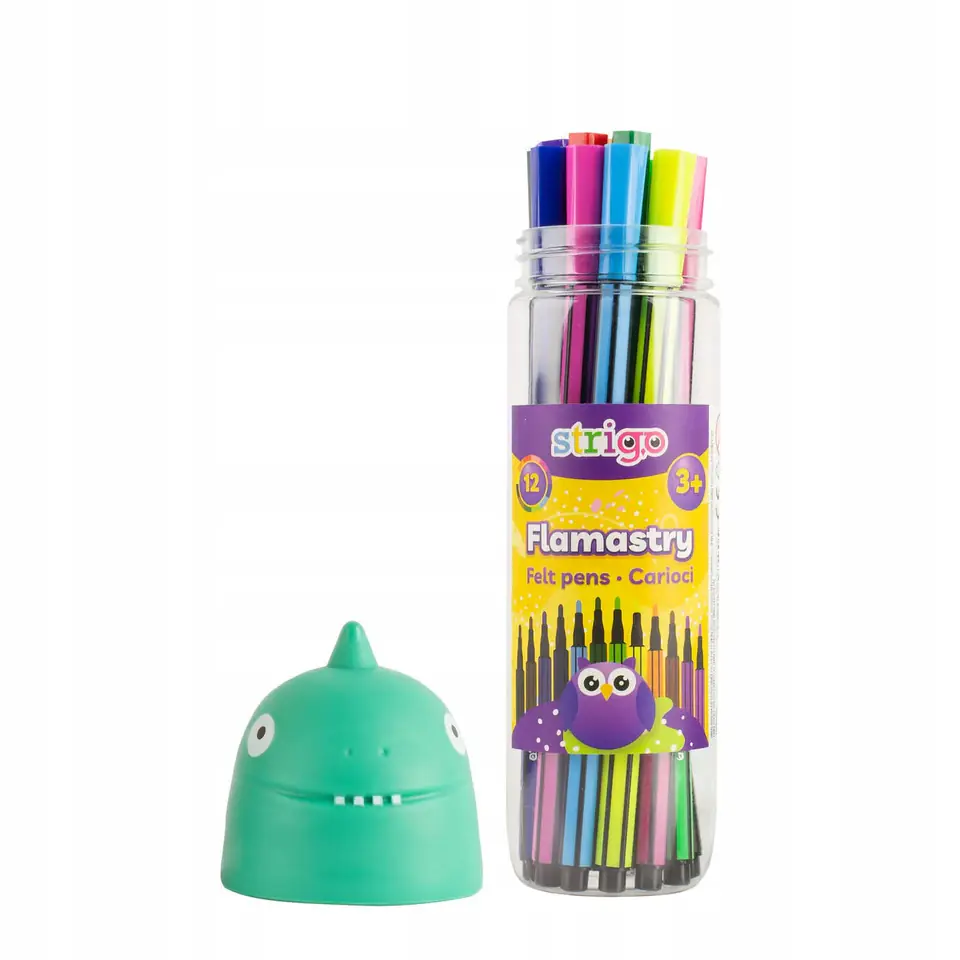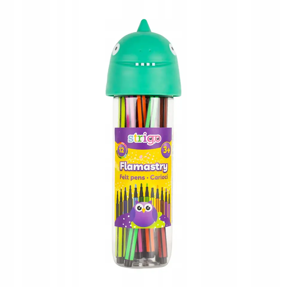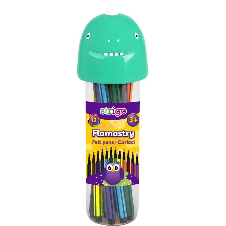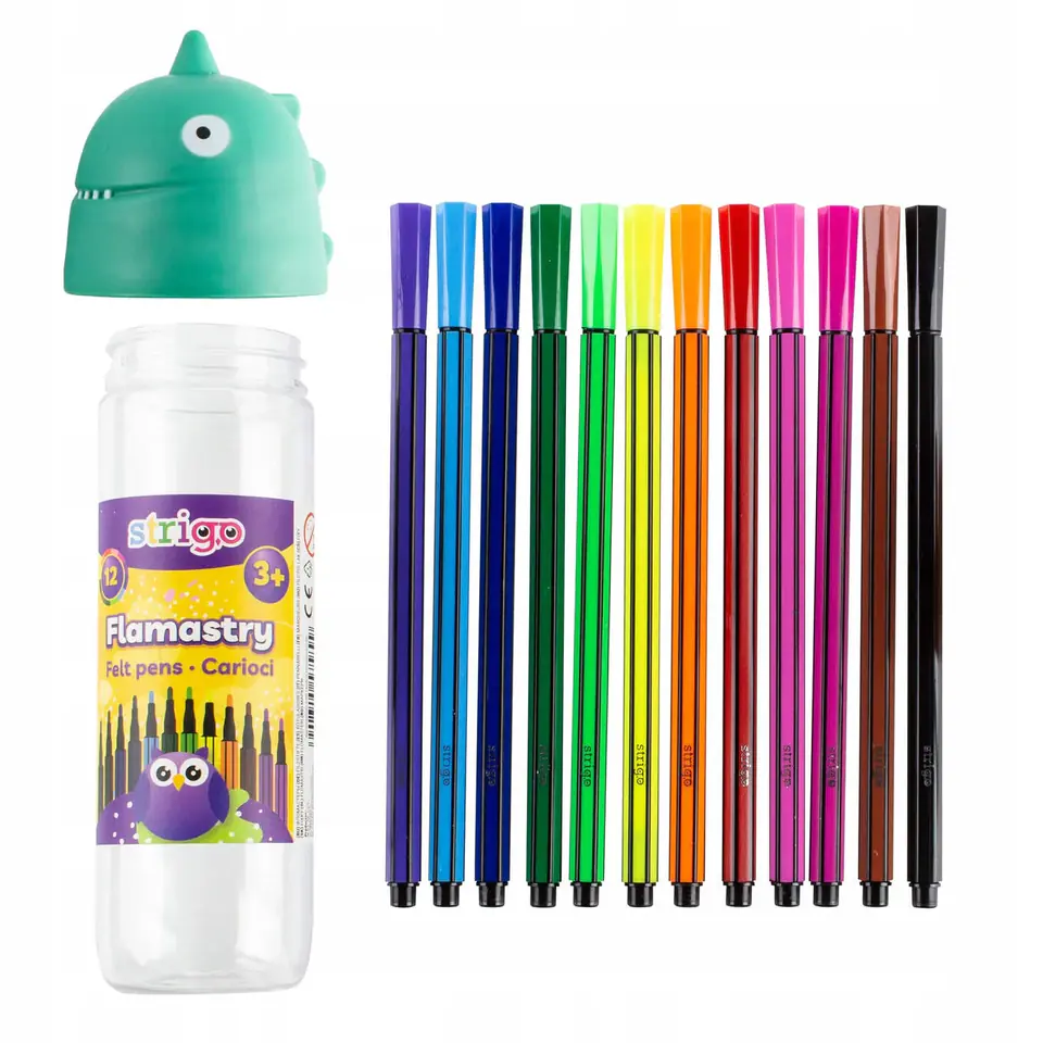 Flamastry STRIGO Dinozaur w 12 glebokich intensywnych kolorach to produkt, który pokocha kazdy, od pierwszego uzycia, poniewaz są one uniwersalnym narzedziem plastycznym.