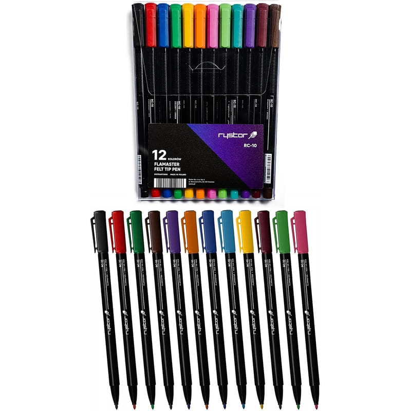 * flamastery RYSTOR RC-10 * stworzone z myślą o dzieciach, uczniach i profesjonalistach * wyposażone w odporną na rozwarstwianie fibrową końcówkę piszącą o grubości 1,0 mm * wentylowana skuwka i obudowa w kolorze tuszu * nasadka posiada wygodny klips * wysokiej jakości tusz na bazie wody * nietoksyczny i bezwonny * odporny na blaknięcie * daje niespotykanie wyraziste, trwałe I intensywne kolory * odporny na wysychanie * flamastry mogą być pozostawione bez zatyczki przez wiele dni (nie krócej niż produkty z systemem DRY SAFE INK i CAP OFF) - nie zaschną zgodnie z wymogami normy ISO 554 * nie rozpuszczają tonera i niezmywalnego tuszu * obudowa, korek obudowy, nasadka wykonane z polipropylenu * korek nasadki wykonany z tworzywa ABS * końcówka pisząca wykonana z fibry * w opakowaniu 12 flamastrów: bordowy, brązowy , czarny, czerwony, fioletowy, jasnozielony, niebieski, pomarańczowy, różowy, turkusowy, zielony, żółty * symbol produktu: 445-120 * jednostka sprzedaży 1 opakowanie * firma RYSTOR to historia polskiego piśmiennictwa i kreślarstwa od 1968 roku - właśnie wtedy została założona w BYDGOSZCZY przez RYSZARDA STACHOWICZA - jako pierwsza i jedyna w POLSCE zaczęła produkować pisaki kreślarskie - jest polskim, rodzinnym producentem cienkopisów, długopisów, markerów oraz rapidografów - łączy najnowsze technologie z wieloletnim doświadczeniem projektantów i pracowników - produkty powstają z najlepszych dostępnych materiałów i półfabrykatów - firma samodzielnie projektuje i testuje każdy nawet najmniejszy element - ponad 50-letnie rapidografy… nadal kreślą i niejednokrotnie są przekazywane z pokolenia na pokolenie - każdy wyprodukowany artykuł pomaga artystom, projektantom, pracownikom biurowym ale także dzieciom, młodzieży i studentom w codziennej pracy, zabawie i wirze kreatywnych uniesień - produkty LENIAR dostępne są nie tylko w całej POLSCE, ale także w EUROPIE i na innych kontynentach