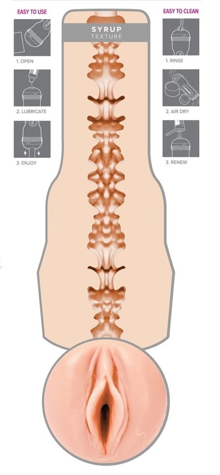 - Wyjątkowa struktura Syrup – Wnętrze modelu to precyzyjnie opracowany system anatomicznych wypustek i żebrowań, ktore zapewniają zrożnicowane odczucie kontaktu mechanicznego podczas użytkowania.