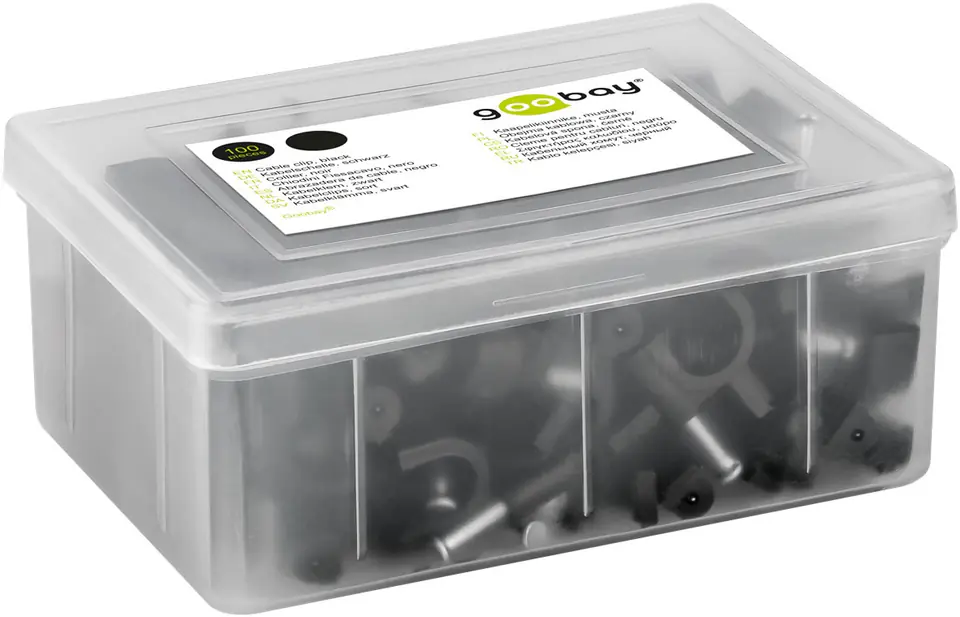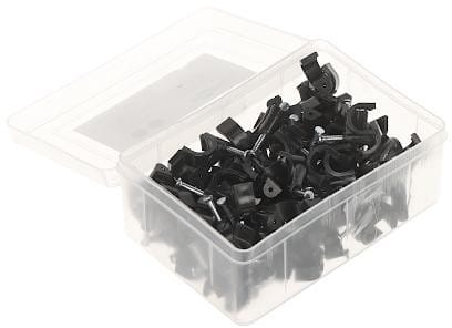 FLOP - uchwyt kabla z gwoździem do mocowania, kolor czarny, 100 sztuk w plastikowym pudełku