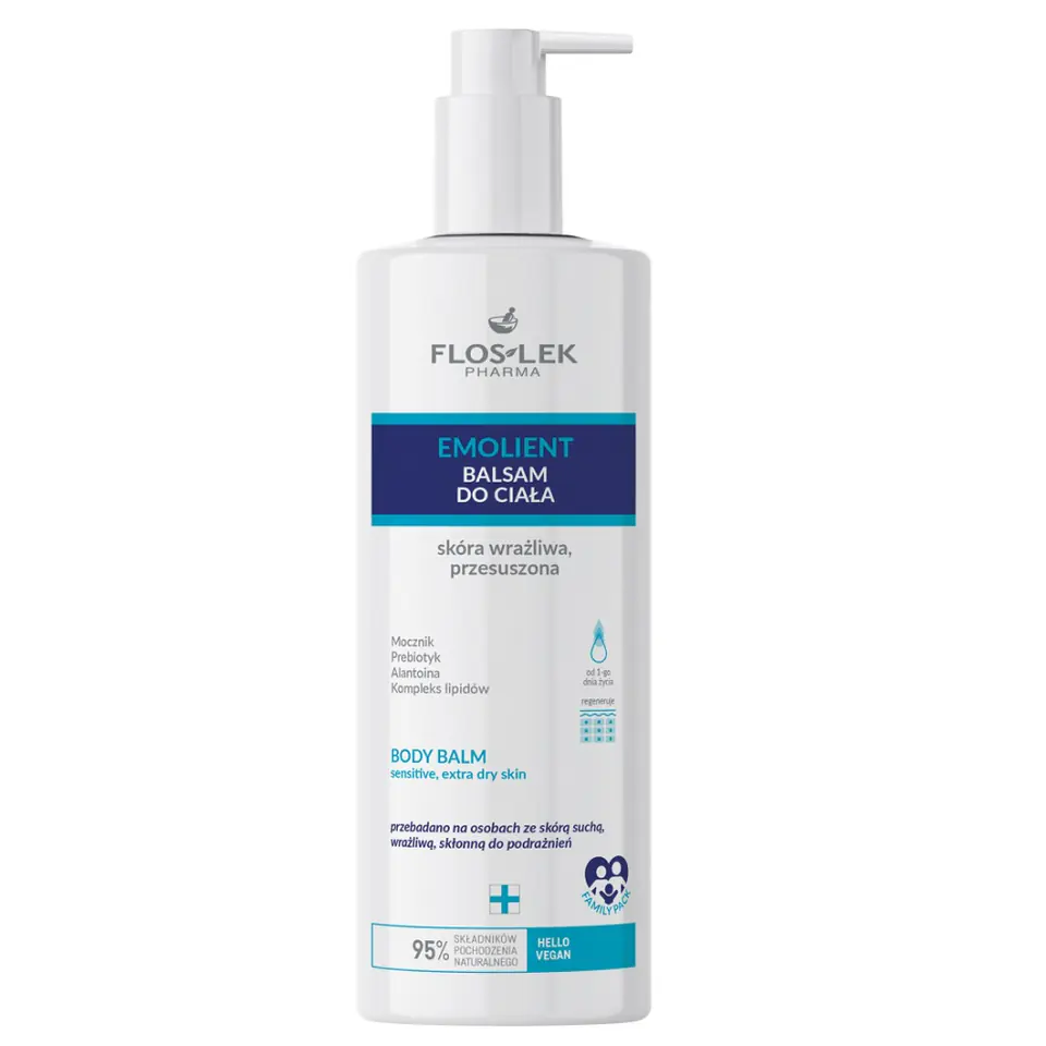 Floslek Emolient balsam do ciała skóra wrażliwa i przesuszona 400ml (P1)5905043024059Balsam do pielęgnacji skóry wrażliwej, bardzo suchej, skłonnej do atopowego zapalenia skóry (AZS), łuszczącej się, szorstkiej, swędzącej, zaczerwienionej i z uczuciem pieczenia. Nadaje się do stosowania przez dorosłych i dziecinbspod 1. dnia życia.Właściwości:• przynosi natychmiastową ulgę w dyskomforcie wywołanym suchością, łuszczeniem się, napięciem, swędzeniem i pieczeniem• przy regularnym stosowaniunbspłagodzi dyskomfort, zapobiega suchości i łuszczeniu się skóry• intensywnie nawilża skórę• korzystnie wpływa na warstwę hydrolipidową naskórka, optymalnie natłuszcza skórę• regeneruje, poprawiając kondycję i wygląd skóry• chroni przed szkodliwym działaniem czynników zewnętrznychProdukt wegański, zawiera 95% składników pochodzenia naturalnego, w tym mocznik, prebiotyk i kompleks lipidów.Sposób użycia:nbspna umytą i osuszoną skórę nakładać cienką warstwę balsamu 1-2 razy dziennie, delikatnie wklepując. Nadaje się do stosowania na całe ciało.