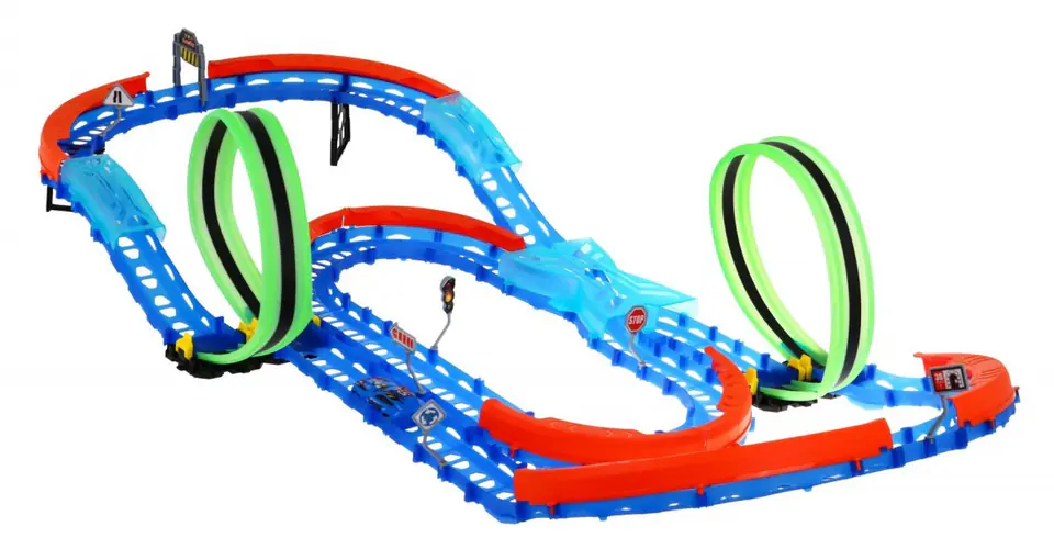 Duży tor z dwoma pętlami to propozycja dla dzieci od 3-go roku życia. Zabawka zasilana jest bateriami typu 1 x 3,7V - autko (w zestawie) oraz bateriami typu 2 x AAA - pilot (brak w zestawie). Tor jest fluorescencyjny, świeci w ciemności. Samochodzik posiada podświetlenie LED, jeżdżąc tworzy niesamowite efekty. Życzymy udanej zabawy.
