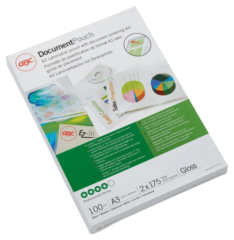 Folia do laminacji GBC Document A3 175 mic. 3200746 Wygodne rozwiązanie do ochrony i wzmocnienia przekazu najważniejszych stron prezentacji, listów referencyjnych, kart produktów, ogłoszeń itp. Format A3, 2 x 175 mikronów, z połyskiem. Opakowanie: 100 szt. - Wysokiej jakości konstrukcja