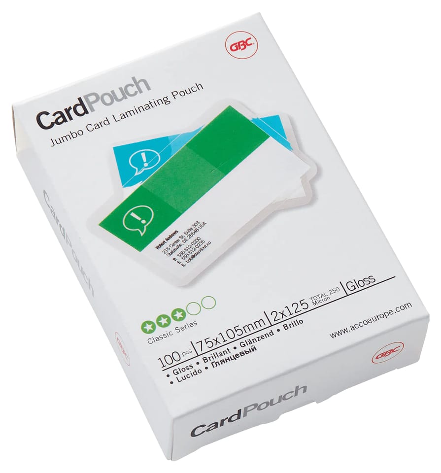 Folia do laminacji GBC Pouch 75x105mm 12 125Mic 3740303 Folie do laminacji różnego rodzaju kart, w tym kart okolicznościowych, licencyjnych i materiałów reklamowych. Dostępne w szerokiej gamie formatów i grubości. Format: 75 x 105 mm. Grubość 125 mikronów, błyszczące. Opakowanie: 100 sztuk.