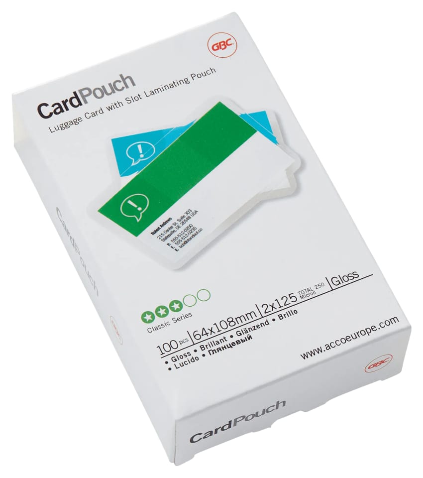 Szeroka gama folii w różnych rozmiarach i o różnych grubościach, przeznaczonych do laminacji niewielkich formatów, w tym np. identyfikatorów, kart licencyjnych i materiałów reklamowych. 64 x 108 mm. 2 x 125 mikronów, z połyskiem. Opakowanie: 100 szt.Cechy produktów