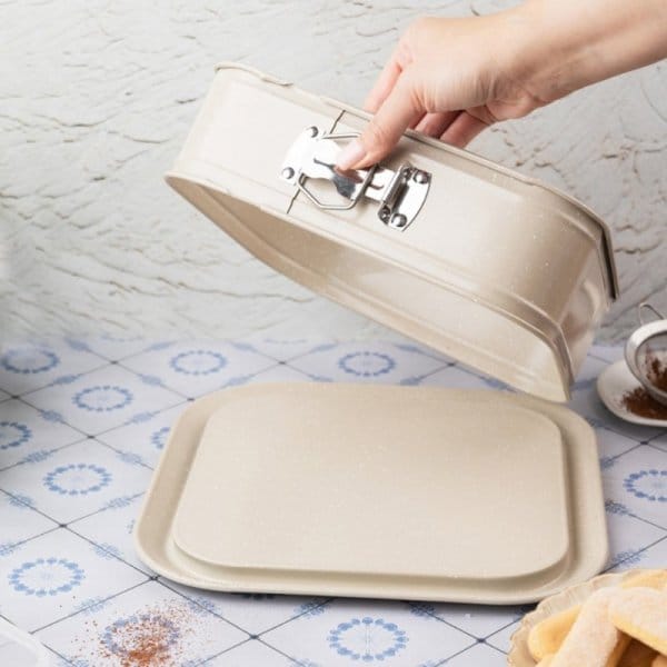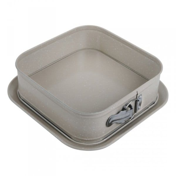 Marmurkowa powłoka nieprzywierająca umożliwia pieczenie z minimalną ilością tłuszczu i sprawia, że wypieki łatwo odchodzą od formy, zachowując idealny kształt. Dzięki odpinanemu bokowi z klamrą formę można błyskawicznie otworzyć, a wypiek lub deser zaserwować bezpośrednio na stabilnej tacy dolnej, bez potrzeby przekładania.