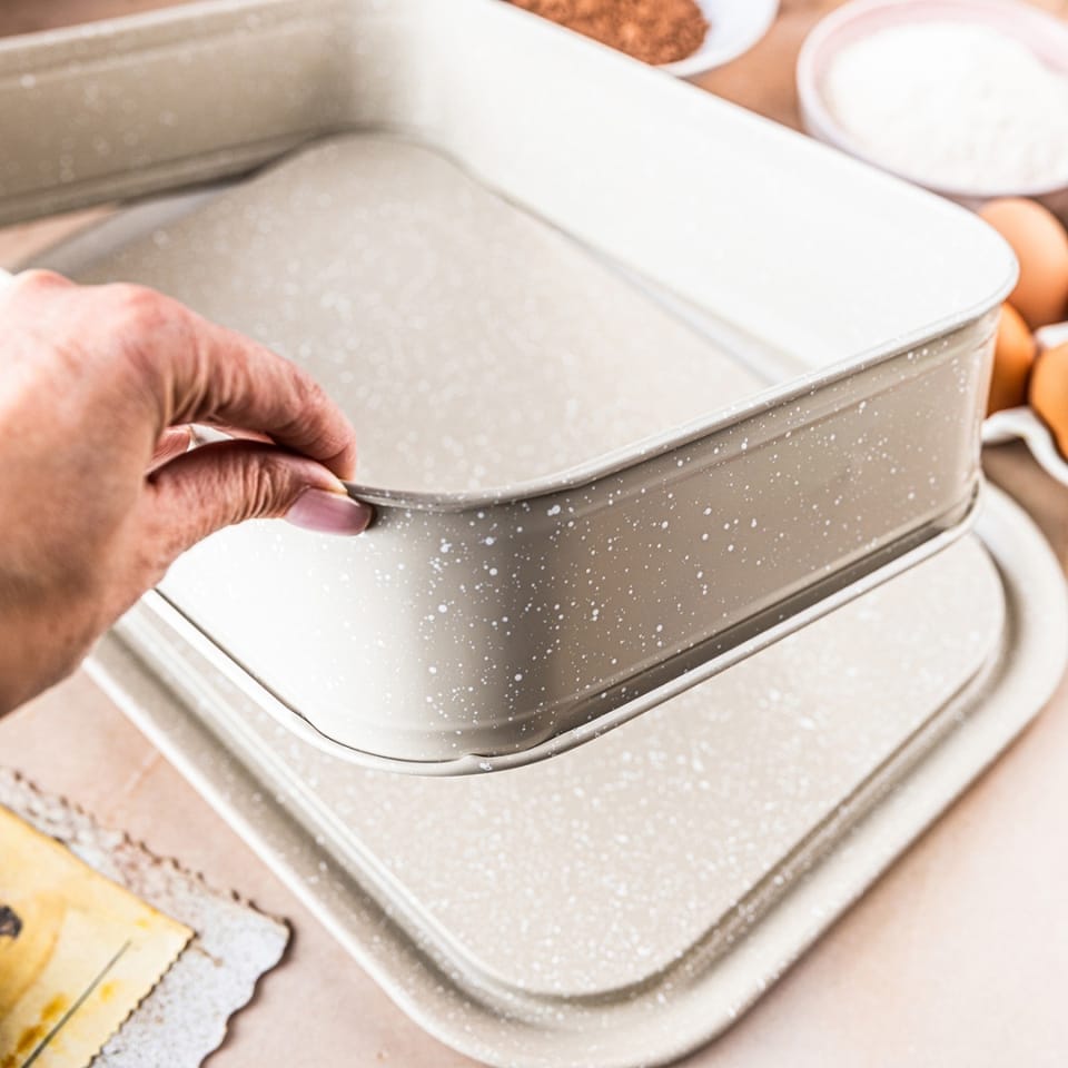 - Marmurkowa powłoka nieprzywierająca – łatwe wyjmowanie ciast bez przypalania.