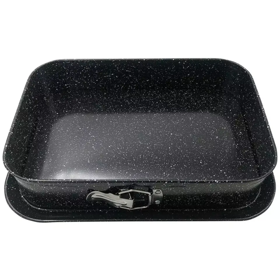 Prostokątna forma z odpinanym rantem do pieczenia ciast firmy KINGHOFF. Dzięki możliwość rozpięcia rantu mamy możliwość łatwego wyjęcia z formy naszego wypieku. Forma pokryta jest powłoką marmurkową zapobiegającą przywieraniu wypieków.