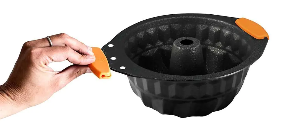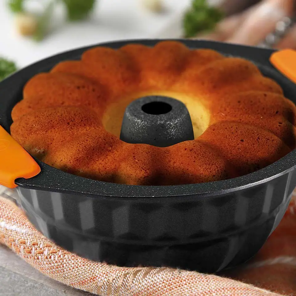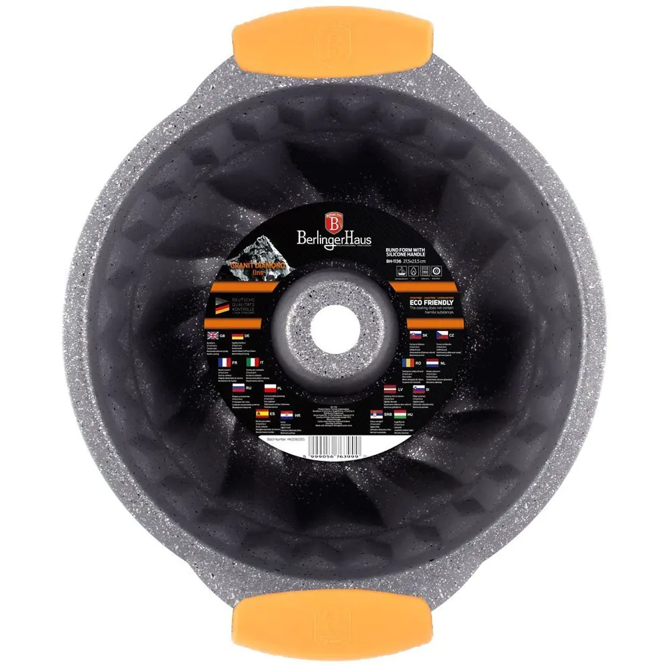 Forma do pieczenia babki firmy BERLINGERHAUS z serii GRANIT DIAMOND. Wykonana z blachy stalowej, pokrytej nieprzywierającą powłoką granitową w kolorze czarnym. Forma wyposażone tak jak cała seria Granit Diamond w silikonowe nakładki na uchwyty.