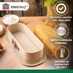 Forma KINGHoff KH-1976 to podłużna forma z odpinanym bokiem i klamrą, zaprojektowana z myślą o wygodnym pieczeniu i estetycznym serwowaniu. Wykonana z grubej stali węglowej, doskonale przewodzi ciepło, zapewniając równomierne pieczenie nawet gęstych mas. Nieprzywierająca powłoka sprawia, że wypiek łatwo odchodzi od formy bez ryzyka uszkodzenia ciasta, a sprężynowy zamek umożliwia szybkie otwieranie i podanie bez konieczności przenoszenia zawartości.