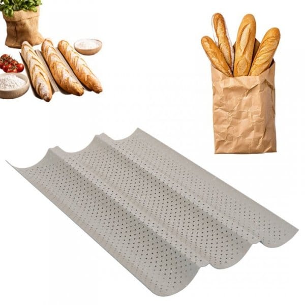 Forma KINGHoff KH-1970 to praktyczna perforowana blacha do wypieku bagietek, która pozwala upiec aż trzy chrupiące bochenki jednocześnie. Specjalnie wyprofilowane rowki utrzymują kształt pieczywa, a setki mikro-otworów zapewniają idealną cyrkulację gorącego powietrza – dzięki temu bagietki wychodzą równo wypieczone, z chrupiącą skórką i lekkim wnętrzem. Powłoka nieprzywierająca typu marmurkowego zapobiega przywieraniu ciasta i ułatwia mycie, a stal węglowa gwarantuje trwałość, stabilność oraz równomierne rozprowadzanie ciepła. To doskonały wybór dla domowych piekarzy, którzy chcą uzyskać efekt jak z francuskiej piekarni. Najważniejsze zalety: Trzy rowki – pieczesz do trzech bagietek jednocześnie, każda z zachowaniem idealnego kształtu. Pełna perforacja – lepsza cyrkulacja powietrza i chrupiący spód pieczywa. Powłoka nieprzywierająca (marmurkowa) – łatwe wyjmowanie i szybkie czyszczenie. Stal węglowa – doskonałe przewodnictwo ciepła i wysoka stabilność formy. Wymiary 38×24,5 cm – pasuje do standardowych piekarników. Odporność termiczna do 220°C – idealna do typowego pieczenia domowego. Do czego sprawdzi się najlepiej: klasyczne bagietki francuskie, długie bułki typu „sub” i hot-dogi, pieczywo razowe, orkiszowe lub bezglutenowe, lekkie podpiekane bułki przed podaniem – chrupiące, ale nie przesuszone. Parametry techniczne: Marka: KINGHoff Model: KH-1970 Rodzaj: forma do bagietek / blacha perforowana Liczba rowków: 3 Wymiary: ok. 38 × 24,5 × 2 cm Materiał: stal węglowa Powłoka: nieprzywierająca, marmurkowa (non-stick) Perforacja: pełna, wentylacyjna Maks. temperatura: do 220°C Kolor: beżowy, marmurkowy FAQ – najczęstsze pytania: Ile bagietek można upiec jednocześnie? Do trzech – forma ma trzy wyprofilowane rowki. Jakiej długości bagietki mieszczą się w formie? Około 35–36 cm (cała forma ma długość 38 cm). Czy potrzebny jest papier do pieczenia? Nie – powłoka non-stick zapobiega przywieraniu. Papier można użyć opcjonalnie. Czy można myć w zmywarce? Tak, choć zalecane jest delikatne mycie ręczne dla ochrony powłoki. Czy forma nadaje się do ciasta bezglutenowego? Tak – perforacja poprawia odparowanie i pozwala uzyskać chrupiącą skórkę. Czy można formować i wyrastać ciasto bezpośrednio na blasze? Tak, wystarczy lekko oprószyć rowki mąką lub natłuścić przed wyrastaniem. ...