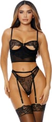 Odkryj wyjątkowy komplet bielizny marki Forplay – model Peek Inside w rozmiarze M. Ten starannie zaprojektowany zestaw składa się z trzech elementow: eleganckiego biustonosza z fiszbinami i charakterystycznymi wycięciami typu peek-a-boo, dopasowanego pasa do pończoch oraz komfortowych majtek. Całość wykonana jest z miękkiej, wysokiej jakości koronki, ktora łączy nowoczesny styl z klasyczną elegancją.