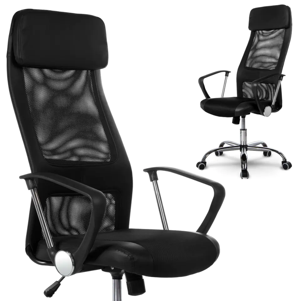 Wysoki fotel z mikrosiatki z chromowaną podstawą.