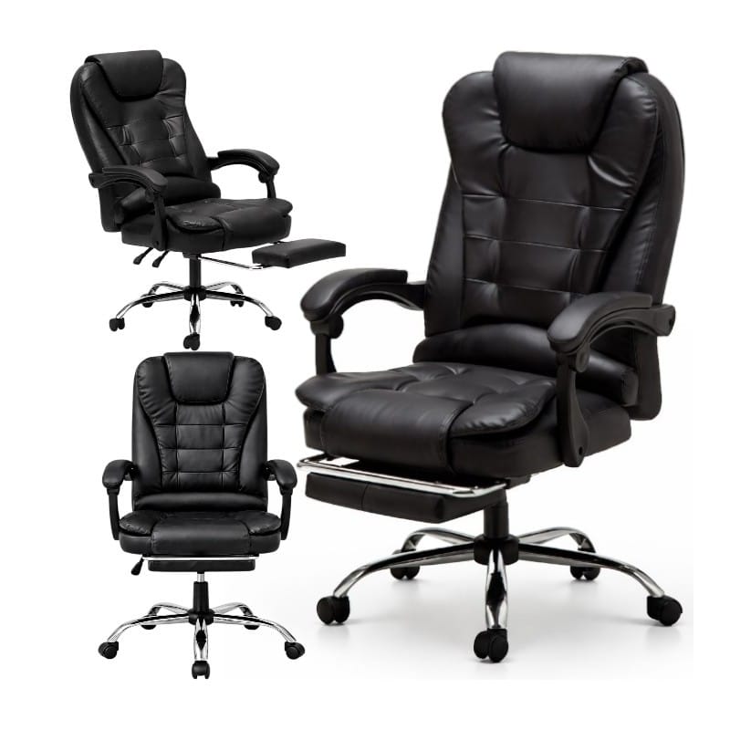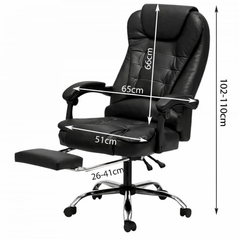 KOMFORTOWY FOTEL BIUROWY Z PODNÓŻKIEM Wymiary:Całkowita wysokość fotela: 102-110cmWysokość oparcia: 66cmCałkowita Szerokość: 51-65cmGłębokość podnóżka: 26-41cmKolor: czarnyMateriał: eko skóra, pianka EPEMaksymalne obciążenie 150 kg Cechy:Siedzisko, wypełnione miękką podwójną gąbkąOparcie, zagłówek powleczone ekoskórąRegulacja kąta odchylenia oparcia wraz z blokadaPodłokietniki pokryte gąbką oraz ekoskóraStabilna i wytrzymała pięcioramienna podstawaWysokiej jakości kółka plastikowe REGULACJA - fotel posiada regulacje wysokości siedziska.Dzięki temu możesz dostosować jego wysokość do swoich indywidualnych potrzeb co jest niewątpliwą zaletą.Możliwość regulacji odchylenia fotela, (90 -155 stopni) gwarantuje Ci chwilę relaksu i rozluźnienia. Pokrycie - szerokie siedzisko, oparcie, zagłówek oraz wierzchnia strona podłokietników powleczone wysokiej jakości ekoskóra, oraz zastosowanie pianki EPE. Wymiary opakowania:68 x 58 x 34 cm Waga: 16 kg Zdjęcia przedstawiają rzeczywisty produkt.