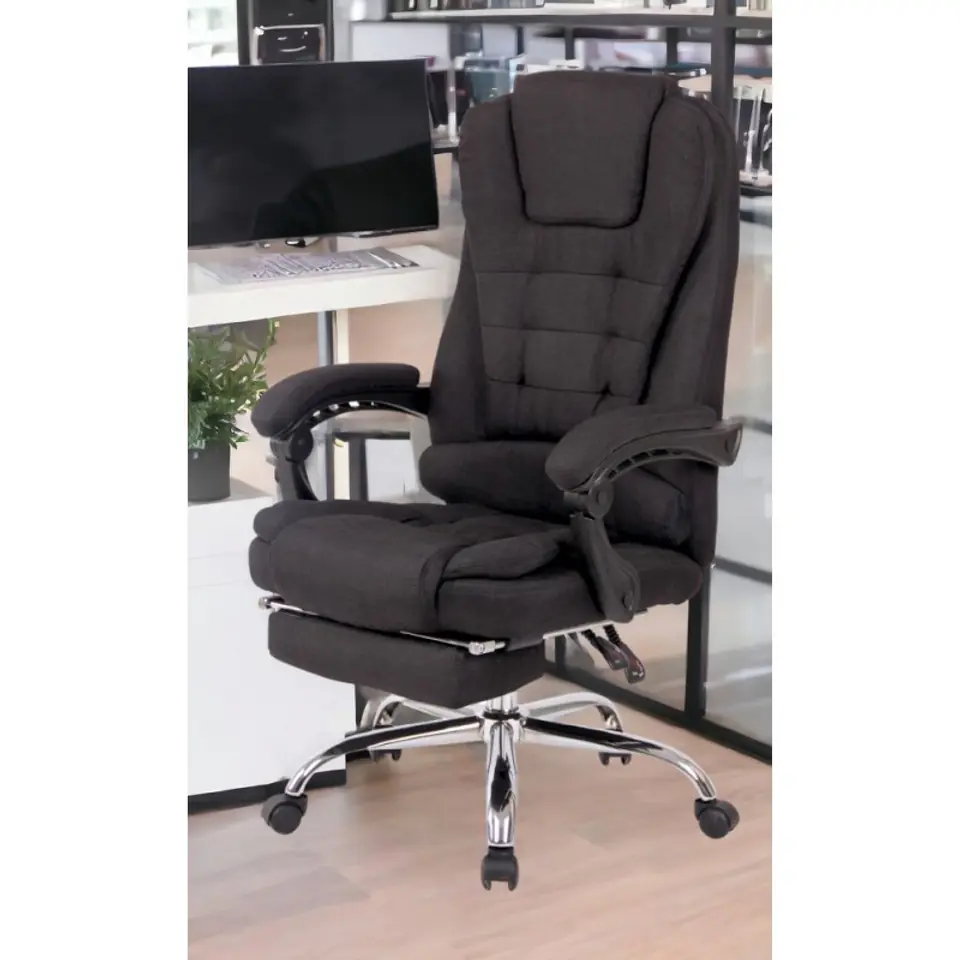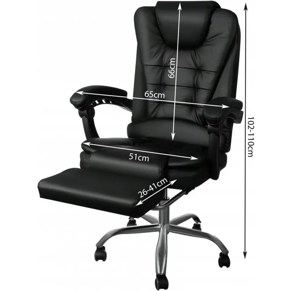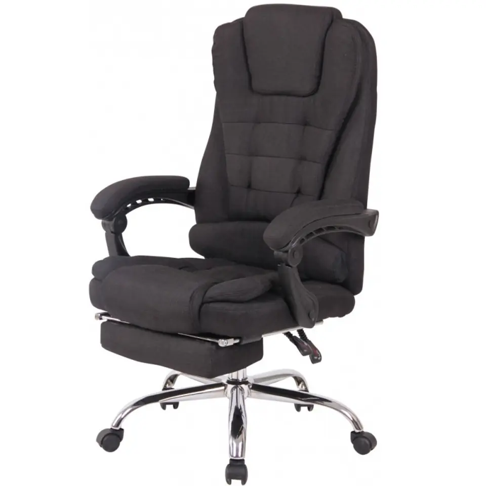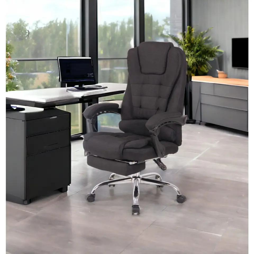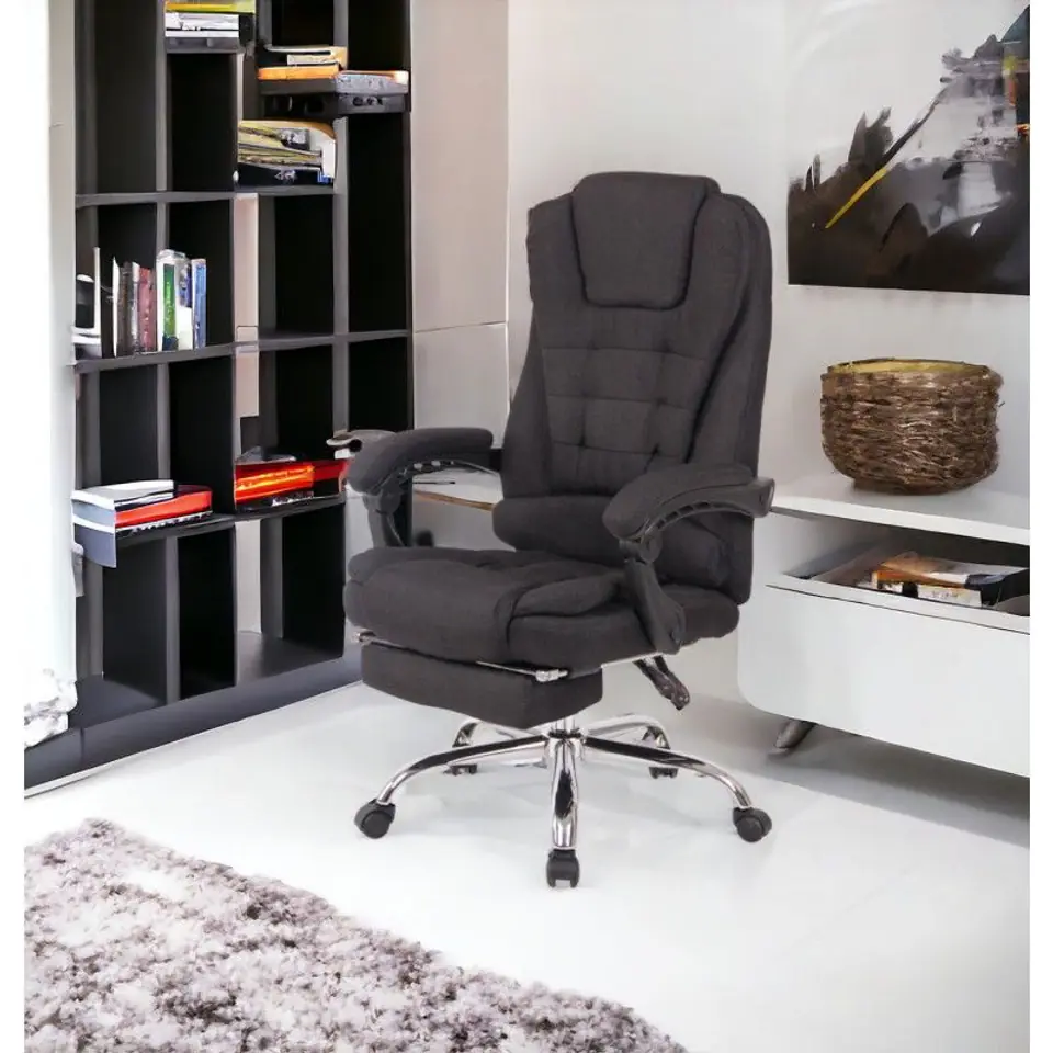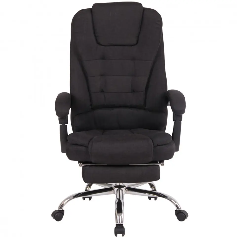 KOMFORTOWY FOTEL BIUROWY Z PODNÓŻKIEM Specyfikacja fotelaKolor: czarny materiałMateriał: tekstylny, pianka EPEWymiary: na zdjęciuMaksymalne obciążenie 150 kgWaga 16 kgWymiary opakowania: 68 x 58 x 34 cm Cechy:- siedzisko, wypełnione miękką podwójną gąbką- regulacja kąta odchylenia oparcia wraz z blokada- stabilna i wytrzymała pięcioramienna podstawa- wysokiej jakości kółka plastikowe REGULACJA - fotel posiada regulacje wysokości siedziska. Dzięki temu możesz dostosować jego wysokość do swoich indywidualnych potrzeb co jest niewątpliwą zaletą. Możliwość regulacji odchylenia fotela, (90 -155 stopni) gwarantuje Ci chwilę relaksu i rozluźnienia.Pokrycie - szerokie siedzisko, oparcie, zagłówek oraz wierzchnia strona podłokietników powleczone materiałem tekstylnym oraz zastosowanie pianki EPE.