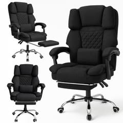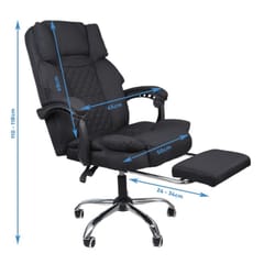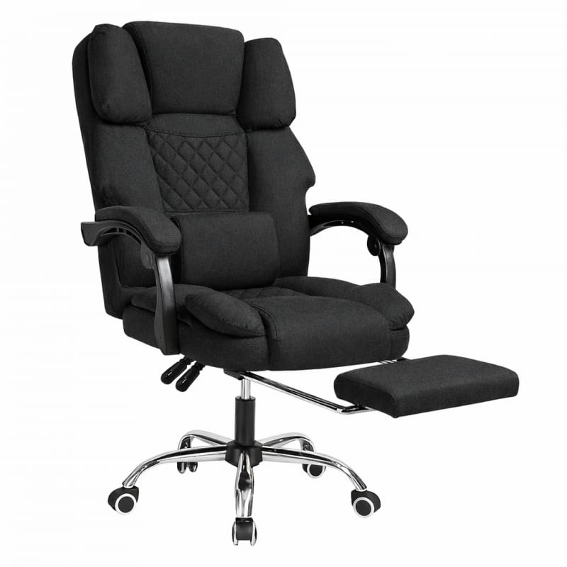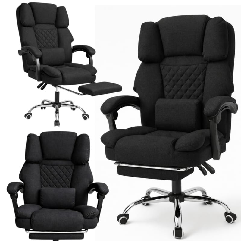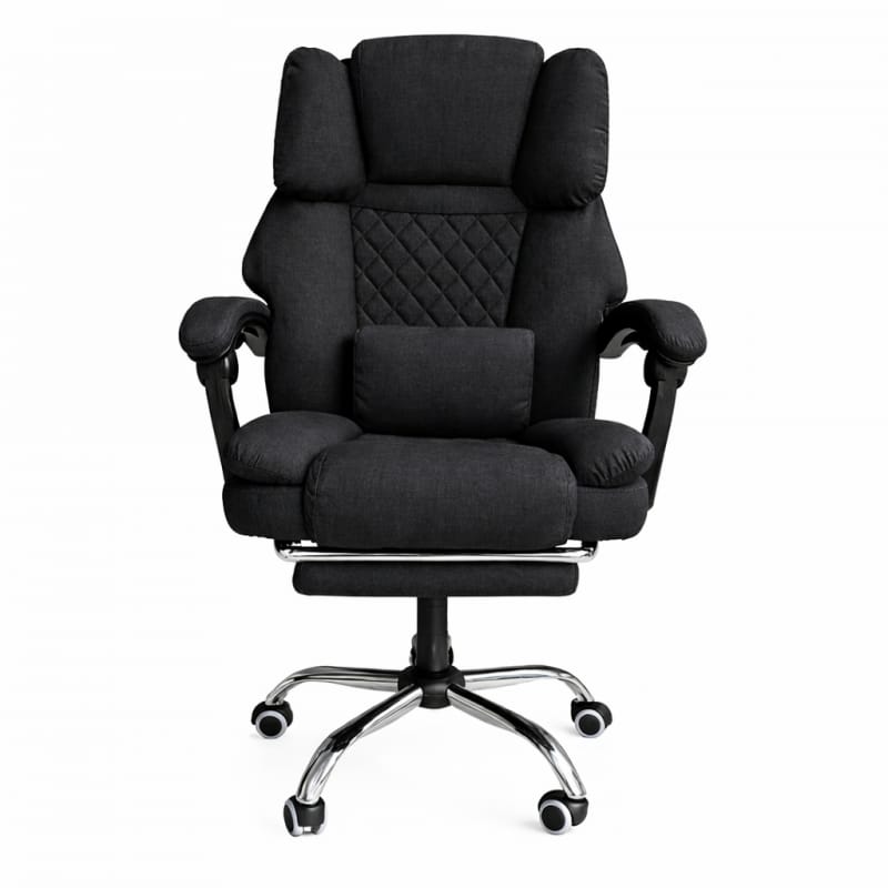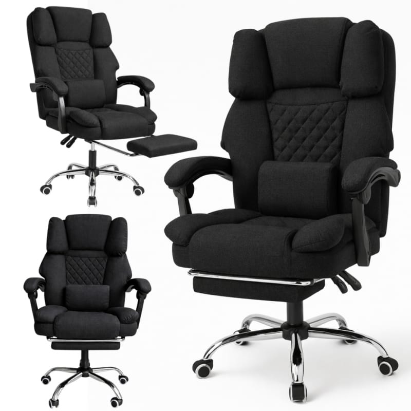 KOMFORTOWY FOTEL BIUROWY Z PODNÓŻKIEM I MASAŻEREM Z KOŃCÓWKĄ USBSpecyfikacja fotelaKolor: czarny materiałMateriał: tekstylny, pianka EPEWymiary: na zdjęciuMaksymalne obciążenie 150 kgWaga 15,5 kgWymiary opakowania: 74 x 32,5 x 59 cmCechy:- siedzisko, wypełnione miękką podwójną gąbką- regulacja kąta odchylenia oparcia wraz z blokada- stabilna i wytrzymała pięcioramienna podstawa- wysokiej jakości kółka plastikowe- poduszka masująca w zestawieREGULACJA - fotel posiada regulacje wysokości siedziska. Dzięki temu możesz dostosować jego wysokość do swoich indywidualnych potrzeb co jest niewątpliwą zaletą. Możliwość regulacji odchylenia fotela, (90 -155 stopni) gwarantuje Ci chwilę relaksu i rozluźnienia.Pokrycie - szerokie siedzisko, oparcie, zagłówek oraz wierzchnia strona podłokietników powleczone materiałem tekstylnym oraz zastosowanie pianki EPE.