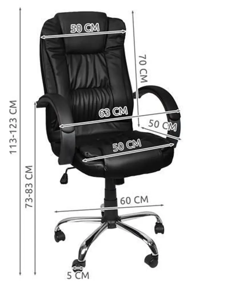 - SPECYFIKACJA – materiał: eko skóra; podstawa: stal chromowana; stelaż: tworzywo; koła: plastik; mechanizm: dźwignia (butterfly); klasa amortyzatora: 136.1 kg; wymiary (dł/szer/wys): 60/63/123cm; regulacja wysokości fotela: 113-123cm; regulacja wysokości siedziska: 73-83cm; maksymalne obciążenie: do 130kg; waga fotela: 16kg; waga z opakowaniem: 17,8kg.