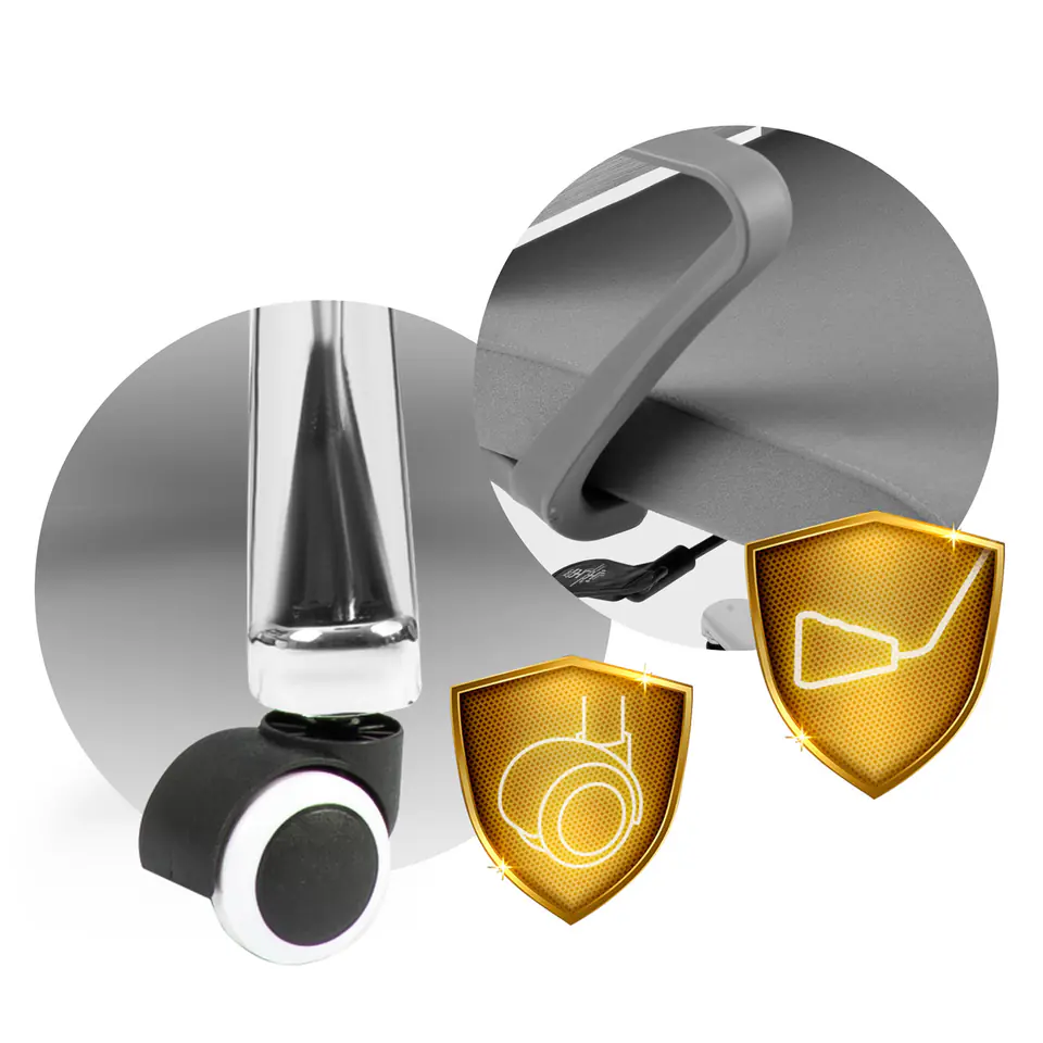 Solidna podstawa wyposażona jest w nylonowo-kauczukowe kółka, które poruszają się cicho i nie rysują podłogi, a elegancki obracający się podnośnik umożliwi blokadę kąta nachylenia w trzech pozycjach.