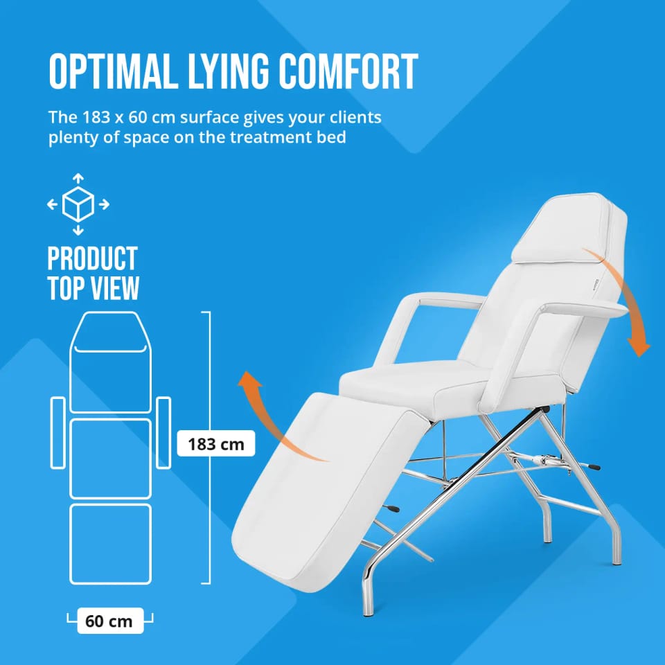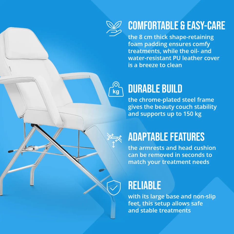 Kod producenta: 10040840Fotel kosmetyczny Matera White marki physa to niezbędny element w gabinecie kosmetycznym lub salonie urody. Sprawdzi się również do salonów stylizacji, tatuażu i piercingu, obiektów SPA i wellness oraz jako stół do masażu. Łóżko kosmetyczne posiada liczne funkcje, dzięki którym praca przy nim jest komfortowa i ergonomiczna. Fotel posiada wielostopniową regulację oparcia pleców i stóp, pozwalającą klientom siedzieć lub leżeć w zależności od zabiegu. W razie potrzeby można zdemontować zagłówek i podłokietniki. Dzięki solidnej i przemyślanej konstrukcji z chromowanej stali fotel uniesie maksymalnie 150 kg. Model wyróżnia się ogromną trwałością i klasycznym wyglądem za sprawą eleganckiego połączenia bieli oraz nowoczesnego chromu. Miękkie wypełnienie oraz najwyższej jakości, odporne na zabrudzenia obicie ze sztucznej skóry zapewnią wysoki poziom komfortu i doskonałą higienę. Gruba poduszka zapewni maksymalny relaks. Fotel posiada funkcję leżenia. Aby z niej skorzystać, wystarczy dostosować leżankę do odpowiedniej pozycji.Cechy produktu: