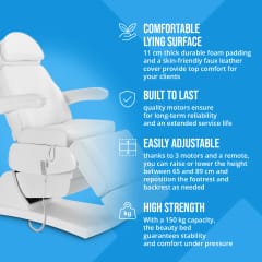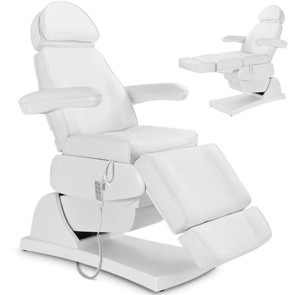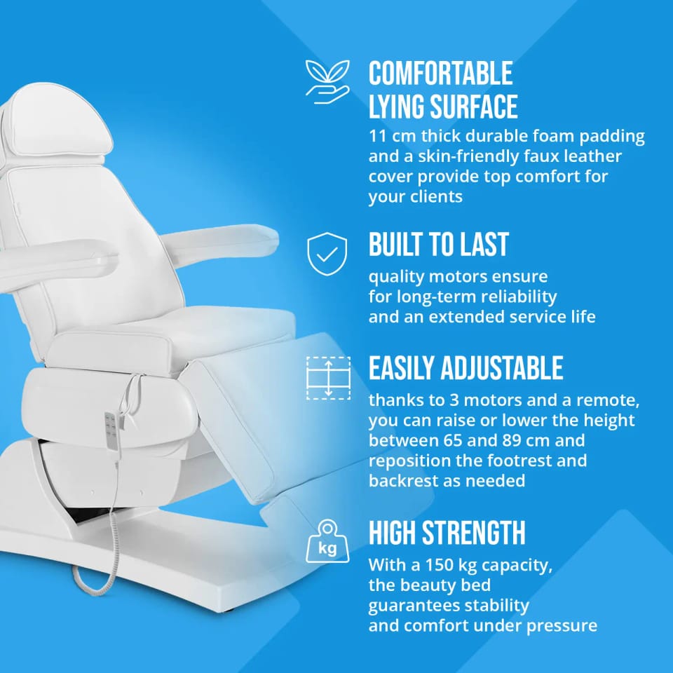 Kod producenta: 10040843W pełni automatyczny fotel kosmetyczny Latina White marki physa zapewni maksymalny komfort podczas leżenia dzięki wypełnieniu o grubości 11 cm. Dzięki łatwemu w utrzymaniu oraz odpornemu na olej i wodę obiciu ze sztucznej skóry (PU) łóżko kosmetyczne łatwo wyczyścić w mgnieniu oka po zabiegu. Dodatkowo stalowa konstrukcja posiada nośność 150 kg. Fotel kosmetyczny nadaje się również do użytku w studiach stylizacji, tatuażu i piercingu, w obiektach SPA Wellness oraz jako stół do masażu. Łóżko posiada liczne możliwości regulacji, które zapewnią wygodne i ergonomiczne pozycje podczas zabiegów. Trzy mocne silniki pozwolą optymalnie określić wysokość siedziska oraz kąt nachylenia oparć pleców i stóp za pomocą pilota. Wysokość ustawia się w zakresie od 65 do 89 cm. Oparcie o wymiarach 560 x 600 mm można przechylić pod kątem od 0 do 76deg;, a podnóżek (200 x 550 mm) w zakresie od 0deg; do 71deg;. Podłokietniki i zagłówek są regulowane ręcznie. Pozwala to osiągnąć optymalną pozycję roboczą przy minimalnym wysiłku.Cechy produktu: