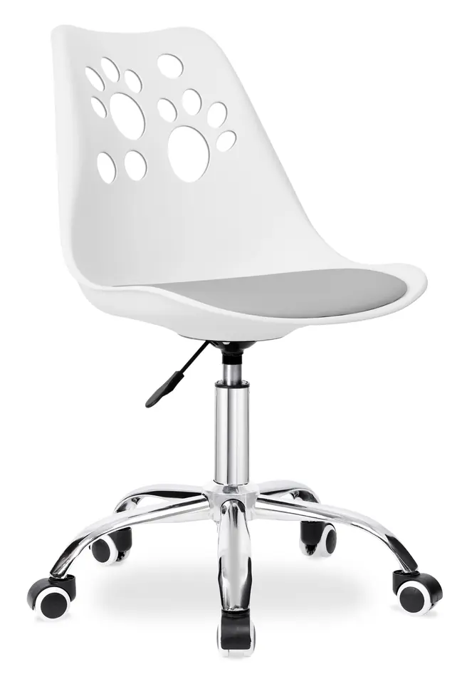 Fotel obrotowy Grover biało-szaryPrzeznaczenie: pokój dziecięcy | Kolory: biało-szary⭐Ergonomiczne, profilowane siedzisko⭐Pastelowa kolorystyka⭐Udźwig 120 kg⭐Zakup bezpośrednio od producenta Krzesło obrotowe dziecięce Grover to solidny fotel biurowy z płynną regulacją wysokości. Oparcie wykonane z tworzywa w zabawne, zwierzęce wzorki- z pewnością zdobędzie uznanie podopiecznych. Miękkie, wygodne siedzisko z ekoskóry oraz stabilnej podstawy zwieńczonej chromem na wysoki połysk.Oparcie profilowane, egronomiczne, dzięki czemu fotel zapewnia wygodę w trakcie zabawy i nauki. Grover jest stabilny i dzięki gumowanym kółkom, także bardzo cichy.Jego pastelowe kolory świetnie wpasują się w każdy pokój dziecięcy. Cechy produktuMateriał siedziska: Tworzywo PP (polipropylen) + poduszka z ekoskóryErgonomiczne, wyprofilowane siedziskoPrzyjazna pastelowa kolorystykaMotyw zwierzęcy na oparciu: kocie łapkiŚwietnie pasuje do pokoju dziecięcegoPłynna regulacja wysokości dzięki wygodnej rączceW pełni obrotowy 360°Solidna podstawaGumowane kółkaChromowane wykończenie elementów metalowychWaga: 5 kgMaksymalne obciążenie: 120 kg Wymiary:Wysokość całkowita 84 - 96 cmWysokość siedziska 46 - 58 cmWysokość oparcia 42 cmSzerokość siedziska/oparcia 48 cmGłębokość siedziska 42 cmSzerokość podstawy 52 cmŚrednica podnośnika 5 cm Informacje dodatkowePrzedstawione kolory należy traktować poglądowo - mogą odbiegać od rzeczywistych ze względu na różne ustawienia monitorów oraz proces obróbki zdjęć. Rzeczywiste wymiary mogą się różnić od podanych wyżej. Tolerancja błędów może wynosić +/- 5%. Marka:eHokeryKod produktu:324615MGKod EAN:5902340324615Kolor:biały, szaryWysokość: 84-96 cmWysokość oparcia:42 cmSzerokość siedziska:48 cmSzerokość podstawy:52 cm