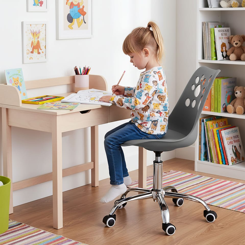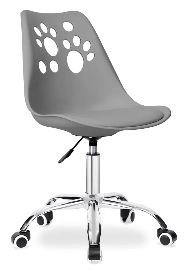 Fotel obrotowy Grover grafitowyPrzeznaczenie: pokój dziecięcy | Kolory: grafitowy, chrom⭐Ergonomiczne, profilowane siedzisko⭐Pastelowa kolorystyka⭐Udźwig 120 kg⭐Zakup bezpośrednio od producenta Krzesło obrotowe dziecięce Grover to solidny fotel biurowy z płynną regulacją wysokości. Oparcie wykonane z tworzywa w zabawne, zwierzęce wzorki- z pewnością zdobędzie uznanie podopiecznych. Miękkie, wygodne siedzisko z ekoskóry oraz stabilnej podstawy zwieńczonej chromem na wysoki połysk.Oparcie profilowane, egronomiczne, dzięki czemu fotel zapewnia wygodę w trakcie zabawy i nauki. Grover jest stabilny i dzięki gumowanym kółkom, także bardzo cichy.Jego pastelowe kolory świetnie wpasują się w każdy pokój dziecięcy. Cechy produktuMateriał siedziska: Tworzywo PP (polipropylen) + poduszka z ekoskóryErgonomiczne, wyprofilowane siedziskoPrzyjazna pastelowa kolorystykaMotyw zwierzęcy na oparciu: kocie łapkiŚwietnie pasuje do pokoju dziecięcegoPłynna regulacja wysokości dzięki wygodnej rączceW pełni obrotowy 360°Solidna podstawaGumowane kółkaChromowane wykończenie elementów metalowychWaga: 5 kgMaksymalne obciążenie: 120 kg Wymiary:Wysokość całkowita 84 - 96 cmWysokość siedziska 46 - 58 cmWysokość oparcia 42 cmSzerokość siedziska/oparcia 48 cmGłębokość siedziska 42 cmSzerokość podstawy 52 cmŚrednica podnośnika 5 cm Informacje dodatkowePrzedstawione kolory należy traktować poglądowo - mogą odbiegać od rzeczywistych ze względu na różne ustawienia monitorów oraz proces obróbki zdjęć. Rzeczywiste wymiary mogą się różnić od podanych wyżej. Tolerancja błędów może wynosić +/- 5%. Marka:eHokeryKod produktu:328828MGKod EAN:5902340328828Kolor:grafitowyWysokość: 84-96 cmWysokość oparcia:42 cmSzerokość siedziska:48 cmSzerokość podstawy:52 cm