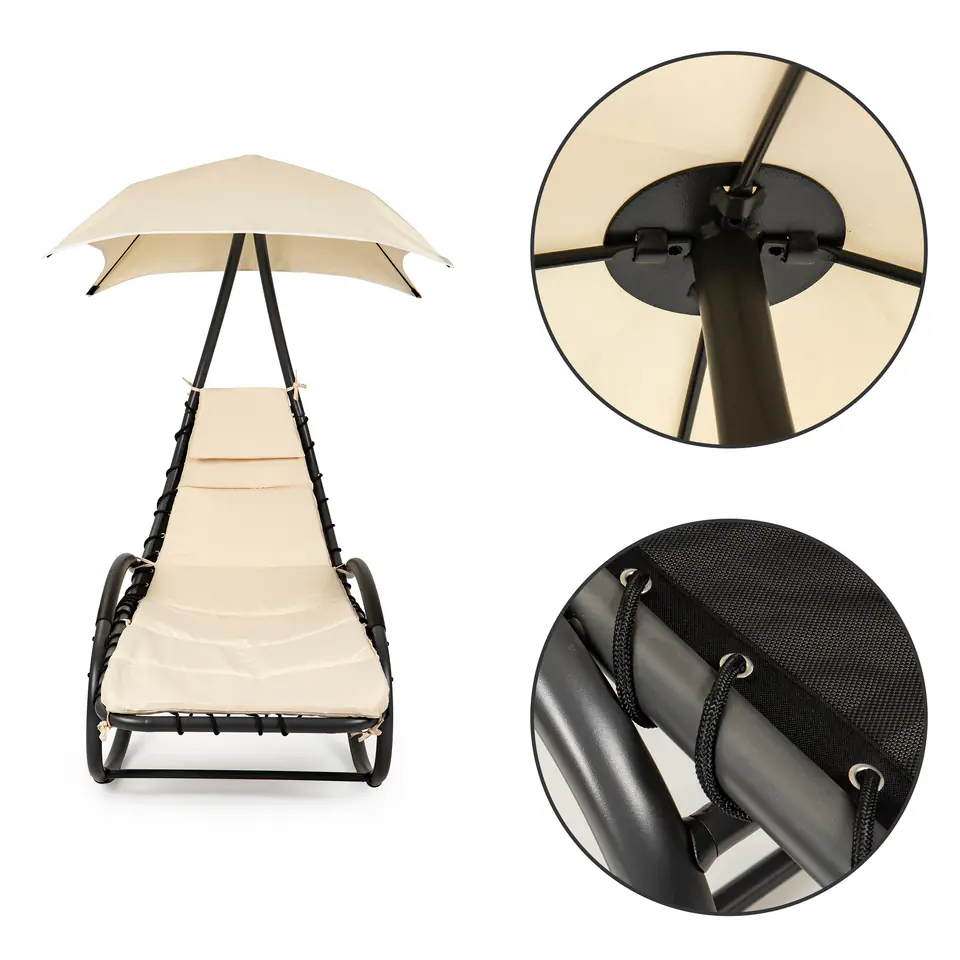 W górnej części leżanki znajduje się funkcjonalny daszek, który zapewni Ci przyjemny cień podczas relaksu na świeżym powietrzu.