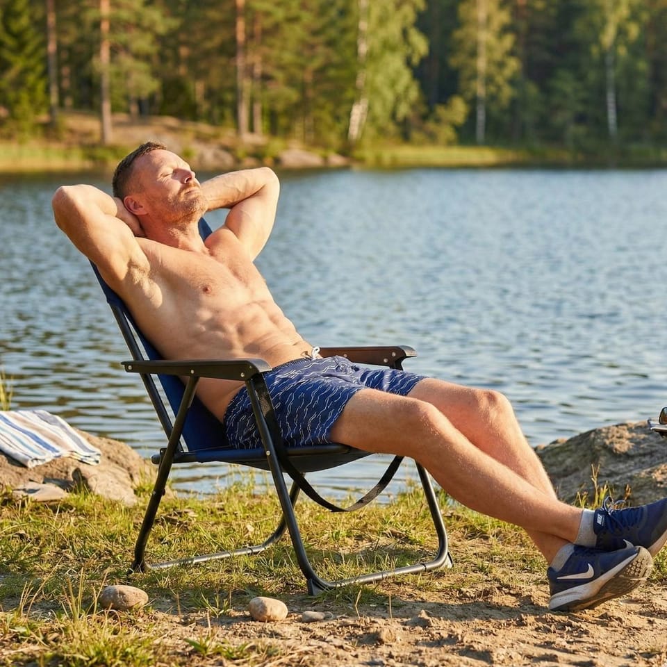 WYSOKOŚĆ OD ZIEMI OK. 25CM - niska wysokość nad ziemią pozwala wygodnie siedzieć bliżej podłoża, co daje bardziej zrelaksowaną, „plażową” pozycję ciała. Dzięki temu fotel jest stabilniejszy, mniej podatny na przewrócenie i idealnie sprawdza się na piasku, trawie czy nierównym terenie.