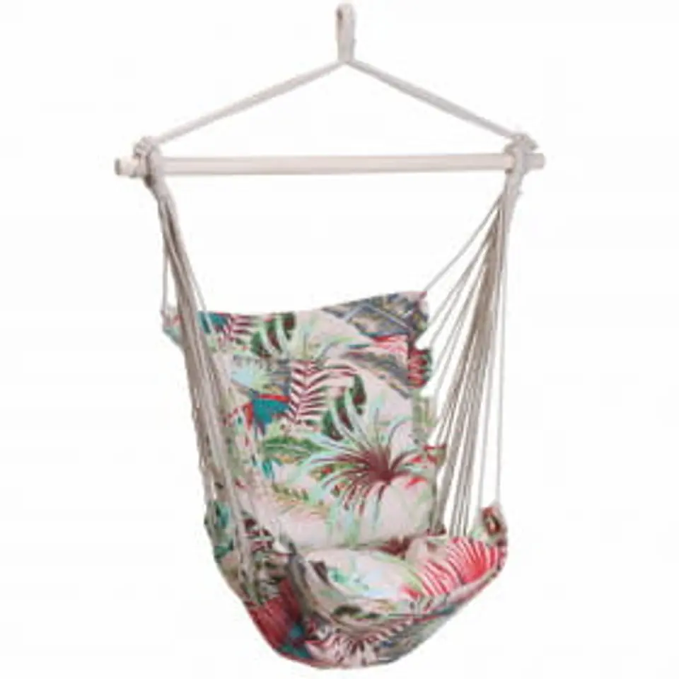 Fotel wiszący brazylijski kwiecisty zielony Ten fotel wiszący pomoże udekorować Twoją przestrzeń życiową dając możliwość wykorzystania go na nieskończenie wiele sposobów. Leżąc lub siedząc w tym fotelu możesz poczuć się jak w hamaku, jednak znajdziesz więcej sposobów jego aranżacji w salonie, pokoju dziecięcym, na tarasie, patio, werandzie i podwórku. Specyfikacja techniczna: Wymiary drewnianej poprzeczki: 80x3 cm Wymiary poduszki: 40 x 40 cm Maksymalne obciążenie: do 100 kg Materiał: 60% bawełna, 40% poliester Możliwość prania ręcznego