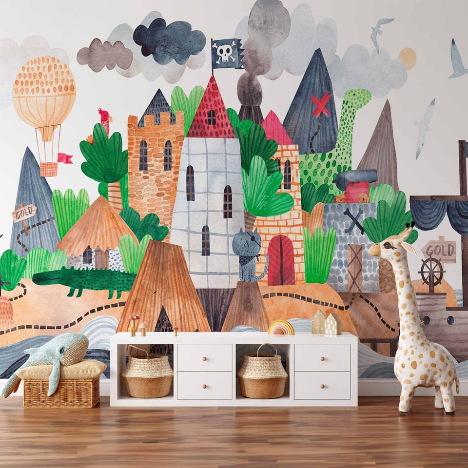 Fototapeta - Kolorowa wyspa skarbów z zamkiem - statek piratów na morzu dla dzieci rozmiar 250x175, wykończenie Standard