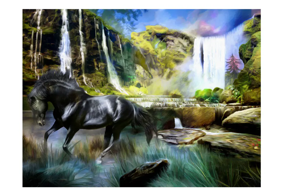 Fototapeta - Koń na tle błekitnego wodospadu rozmiar 350x270, wykończenie Standard