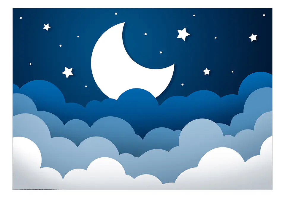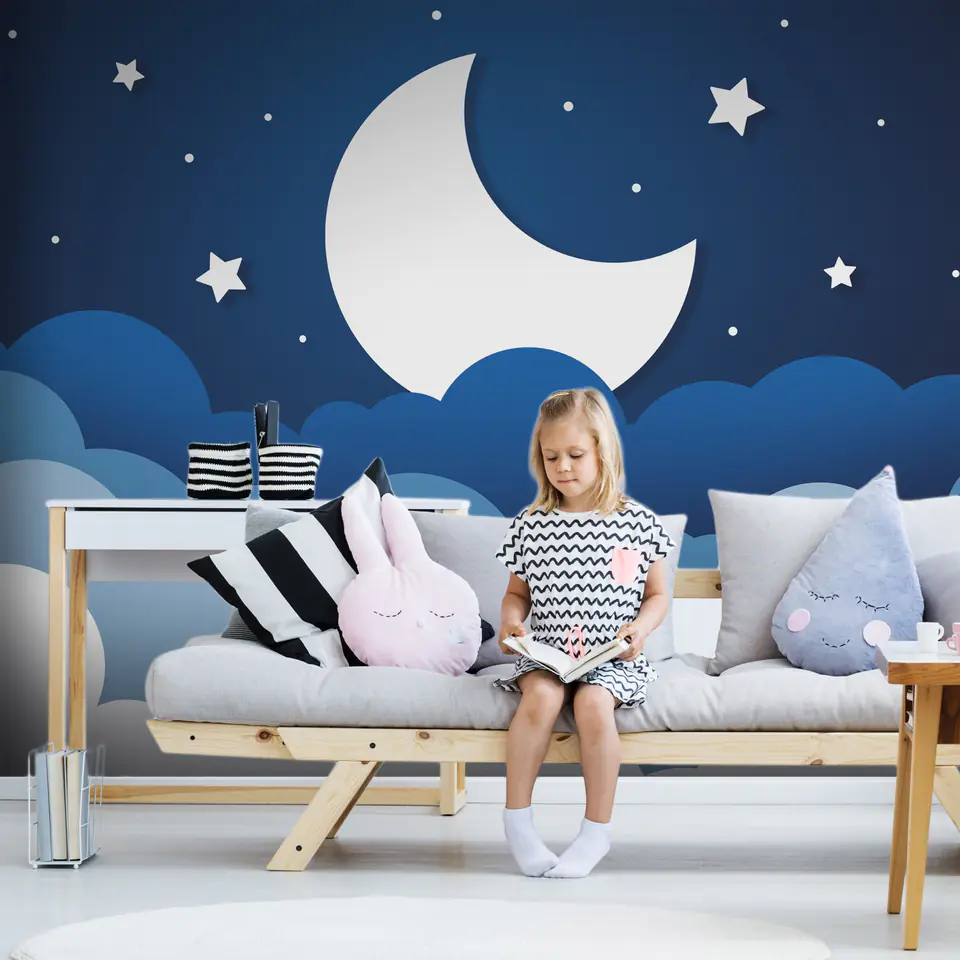 Fototapeta - Księżycowy sen - chmury na granatowym niebie z gwiazdami dla dzieci rozmiar 400x280, wykończenie Premium