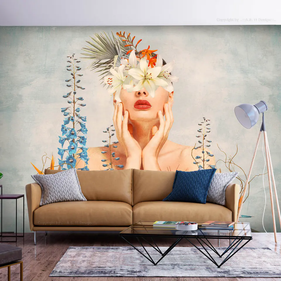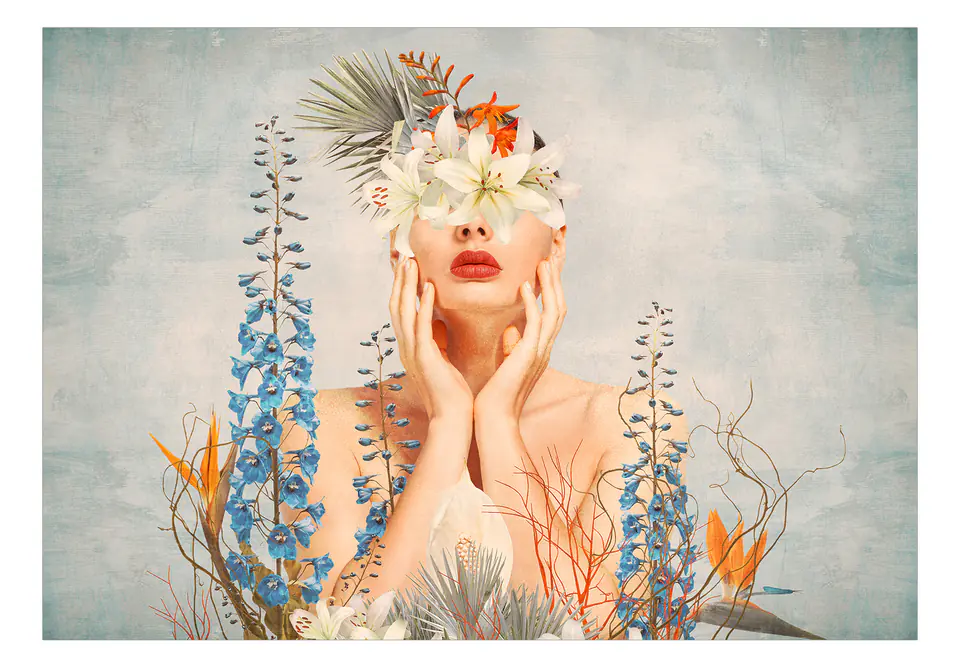 Fototapeta - Natura w myślach - postać kobiety wśród kwiatów na tle z deseniem rozmiar 200x140, wykończenie Premium