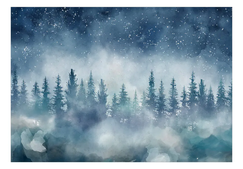 Fototapeta - Nocny krajobraz - pejzaż zamglonego lasu nocą z gwiaździstym niebem rozmiar 400x280, wykończenie Premium