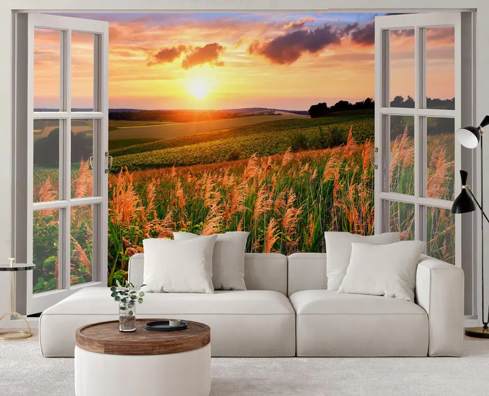 Fototapeta, Okno z widokiem na łąkę zachód słońca Rozmiar 280x200