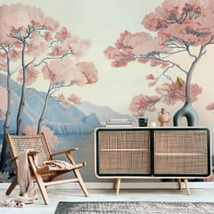 Fototapeta - Pejzaż z oceanem klifami i drzewami w delikatnych różowych barwach rozmiar 400x280, wykończenie Premium