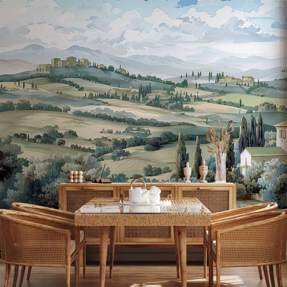 Fototapeta - Pejzaż z zielonymi polami i drzewami toskański słoneczny widok rozmiar 350x256, wykończenie Wodoodporna
