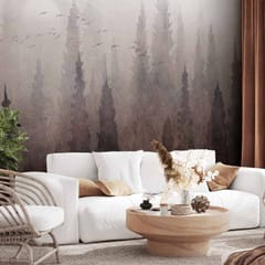 Fototapeta - Przelot ptaków nad koroną drzew - krajobraz ciemnego lasu we mgle rozmiar 250x175, wykończenie Standard