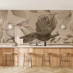 Fototapeta - Ptak wśród liści - motyw roślinny z lecącym pawiem w chłodnych tonach rozmiar 100x70, wykończenie Wodoodporna