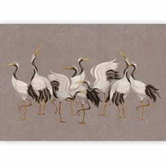 Fototapeta - Taniec żurawi - jasne sylwetki ptaków na ciepło-szarym tle z fakturą rozmiar 350x256, wykończenie Standard