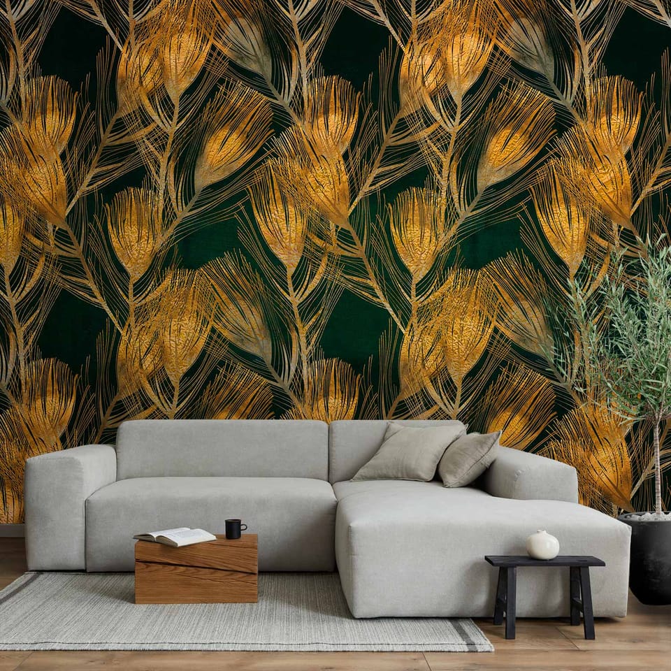 Fototapeta - Złote pióra pawia - jednolite tło z ptasim deseniem na zielonym tle rozmiar 147x105, wykończenie Samoprzylepna