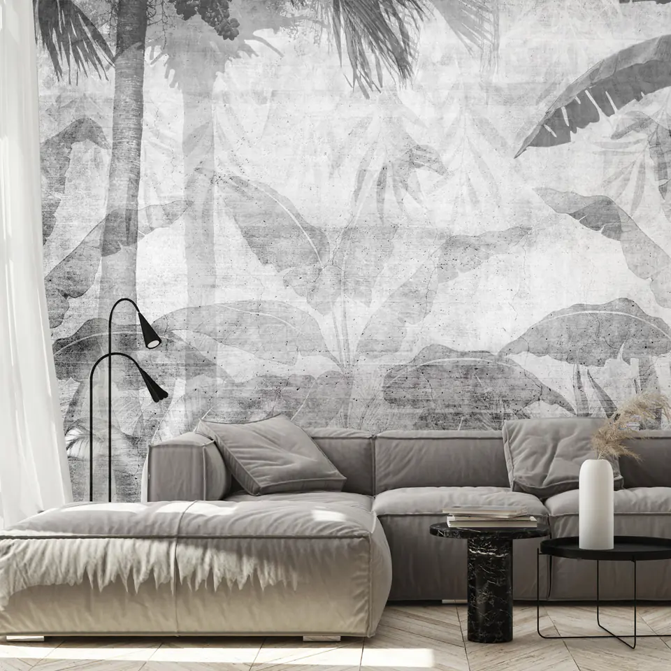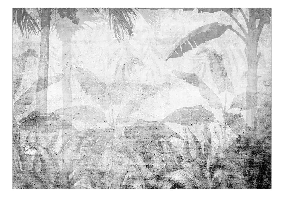 Fototapeta - Znikająca dżungla - pejzaż egzotycznych drzew i liści w szarych tonach rozmiar 200x140, wykończenie Premium