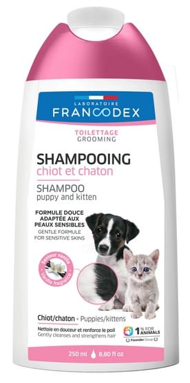 Francodex Szampon dla szczeniąt i kociątPielęgnacja sierści szczeniąt i kociąt wymaga stosowania specjalnych produktów, których skład nie podrażni ich wrażliwej skóry. SZAMPON DLA SZCZENIĄT I KOCIĄT Laboratoire Francodex na bazie delikatnych składników czyszczących z dodatkiem protein pszenicy skutecznie usunie zanieczyszczenia i nieprzyjemne zapachy oraz ułatwi rozczesywanie. Neutralne pH zapobiegnie wysuszaniu skóry i pozwoli na zachowanie naturalnego nawilżenia.Właściwości: