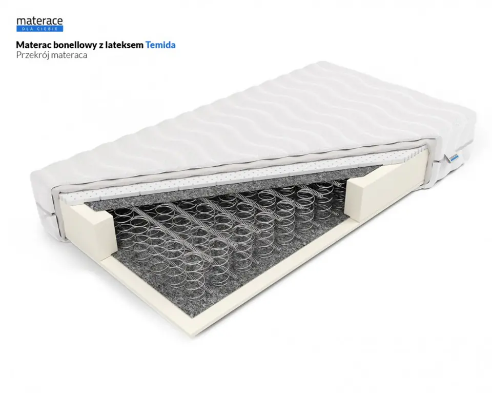 Materac Temida – Materac bonellowy z 108 sprężynami/m² i dwoma różnymi powierzchniami: sprężysty FlexyLateks lub klasyczny ComfortBase. 10 lat gwarancji!