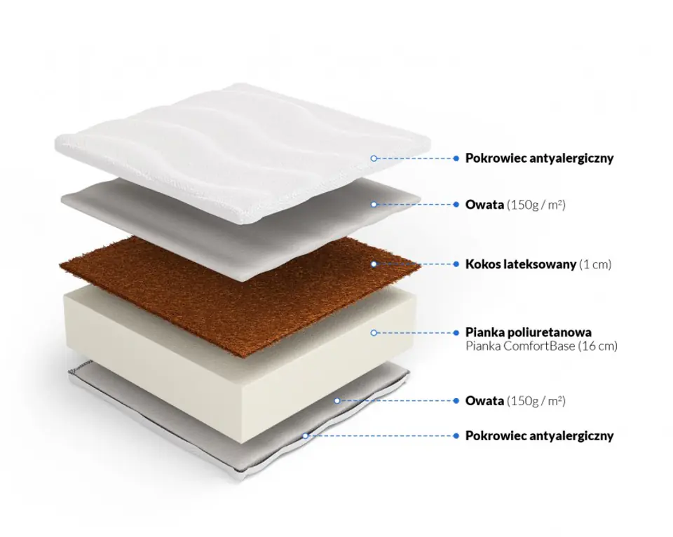 • Szukasz trwałego materaca – Kokos jest odporny na odkształcenia. Gruba pianka 16cm ze wzmocnieniami na krawędziach.