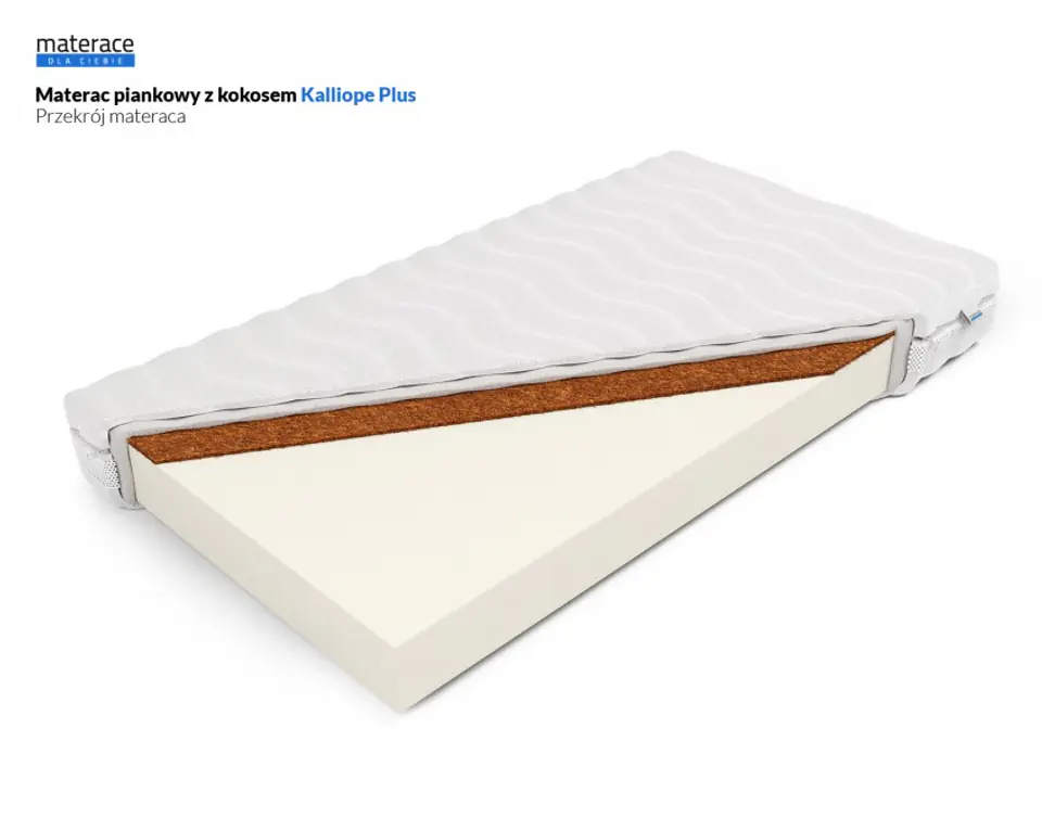 Materac Kalliope Plus – Ulepszona wersja Kalliope: twarda strona z kokosem lateksowanym (H3) dla osób 80+ kg, średnio twarda strona z pianką (H2) dla osób do 80 kg. Grubsza baza 16cm (+6cm), pas wentylujący i zamek rozdzielczy.